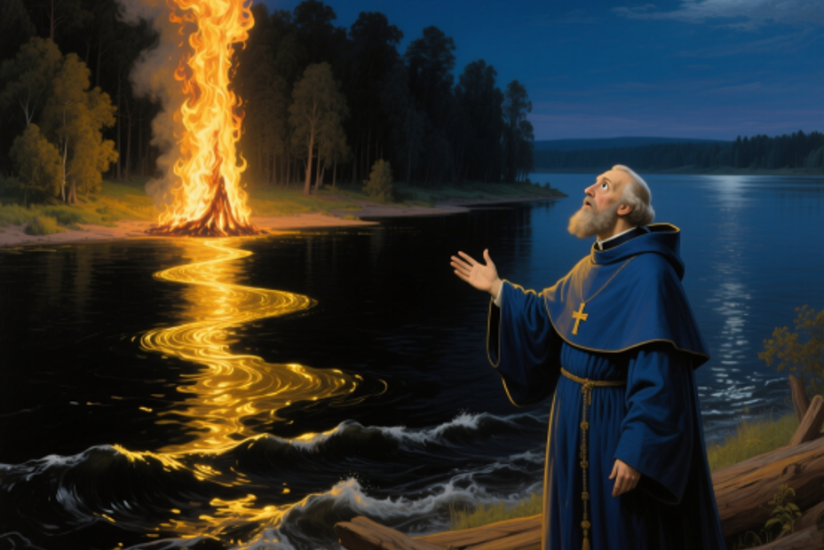 Это был не отсвет костра и не зарница. Пламя было плотным, словно сотканным из золотых нитей, и не колыхалось, а горело ровно и торжественно, освещая кроны вековых сосен и гладь воды «аки днём».