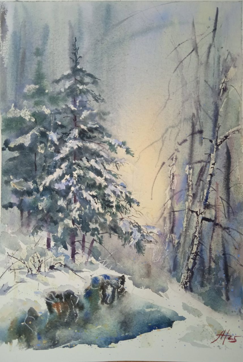 *** Падает снег не спеша. В свете окна искрится Переливаясь, дрожжа. Сказочной вереницей Падает с неба, искрясь Медленно и неспешно. Искренно не торопясь, Плавно и безмятежно Падает. В этой игре Ритмом тысяч волынок Слышится звук снежинок, Падающих в декабре. Георгий Черных Акварель Натальи Семенюк #литературагорногоалтая #живописьгорногоалтая