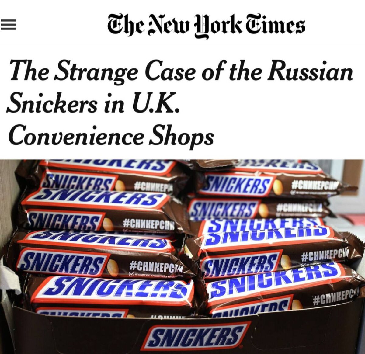 Snickers в Великобритании»: NYT: По всему Лондону в магазинах появились русскоязычные шоколадки «сникерс». «На первый взгляд конфеты в магазинах по всему Лондону казались обычными Snickers. Но надписи на упаковке были полностью на русском. На полках магазинов появились Snickers, покрытые белым шоколадом, а также со вкусом пломбира. Производящая Snickers компания Mars, комментируя появление шоколадных батончиков с русскоязычной упаковкой в Лондоне, заявила, что не сможет помешать посредникам покупать сладости и потом перепродавать их в Европе»