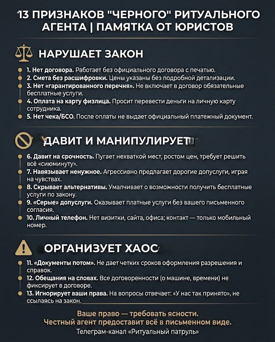 Но как отличить честного ритуального агента от мошенника? Мы собрали 13 главных признаков «чёрного» агента — от грубых нарушений закона до манипулятивных уловок. Сохраните эту памятку себе и поделитесь с другими. Знание этих пунктов — лучшая защита от недобросовестных игроков на рынке. И ПУСТЬ ЭТА ПАМЯТКА ВАМ НИКОГДА НЕ ПОТРЕБУЕТСЯ! #памятка #юрист #ритуальные_услуги #безопасность