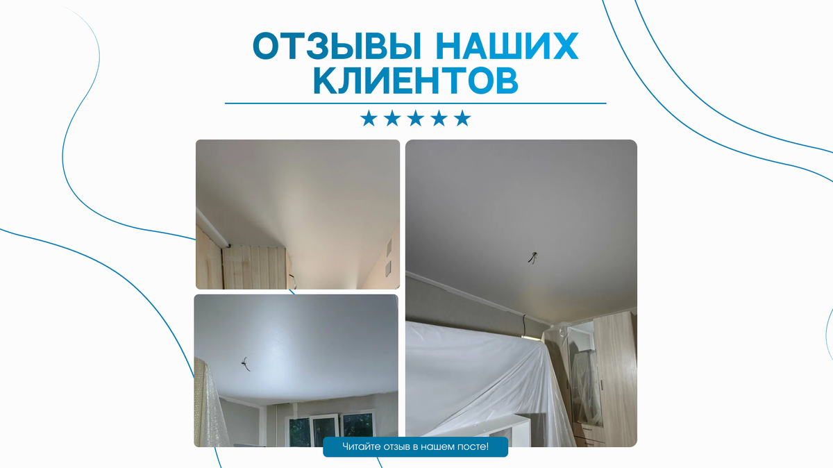 Мы гордимся тем, что наши клиенты считают нас лучшими в своем деле! Отзывы о нашей работе — это не просто слова, а результат честного труда, внимательного подхода и высококачественного сервиса. Об этом говорят отзывы: «Ребята меня спасли. Не могла найти исполнителей за адекватные деньги. Везде надо было ждать и подстраиваться под сроки установщиков. Здесь я получила качественные потолки, недорого, в нужные мне сроки. Из-за сложной конфигурации 2 раза бесплатно выезжал обаятельный замерщик, подсказал идеи, как провести правильно вентиляцию под потолком. Огромная благодарность мастеру за его нелегкий труд, чистоту, скорость и аккуратность. Рекомендую ребят. Одни из самых адекватных в городе.» Мы ценим каждое ваше мнение! Ваши слова — это не просто благодарность, это подтверждение того, что мы на правильном пути, и наша работа действительно имеет значение. Мы всегда стремимся предоставить вам не только качественные услуги, но и обеспечить максимальное удобство и комфорт. Результат нашей р