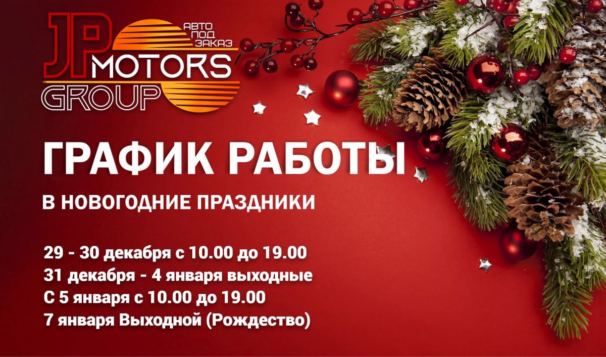 ! ❄️ В этом году наша команда выросла, мы прошли новый путь. Мы работаем так, чтобы вы смогли выбрать автомобиль по душе, оформить и доставить его к вам без лишних хлопот и чувствовать себя уверенно на каждом этапе. А также мы всегда помогаем с дополнительными услугами для вашего удобства! Команда JP Motors Group вместе с вами ждёт новогоднего волшебства: боя курантов, салатов «оливье», мандаринов и звон бокалов. Кто-то отправится поздравлять родителей, кто-то наконец отдохнет и выспится, кто-то впервые встретит Новый год во Владивостоке, других ждут зимние поездки на горнолыжных курортах и сноуборде, а кому-то просто хочется полюбоваться заснеженным лесом. Для вашего удобства приготовили график работы: ❄️НАШИ МЕНЕДЖЕРЫ 29 - 30 декабря с 10.00 до 19.00 31 декабря – 4 января ВЫХОДНЫЕ С 5 января с 10.00 до 19.00 ❄️ВЫДАЧА АВТО ВО ВЛАДИВОСТОКЕ 29 - 30 декабря с 11.00 до 17.00 31 декабря – 4 января ВЫХОДНЫЕ 5,6, 8, 9 января с 11.00 до 17.00 7 января с 11.00 до 14.00 ❄️ ОТДЕЛ ЛОГИСТИКИ
