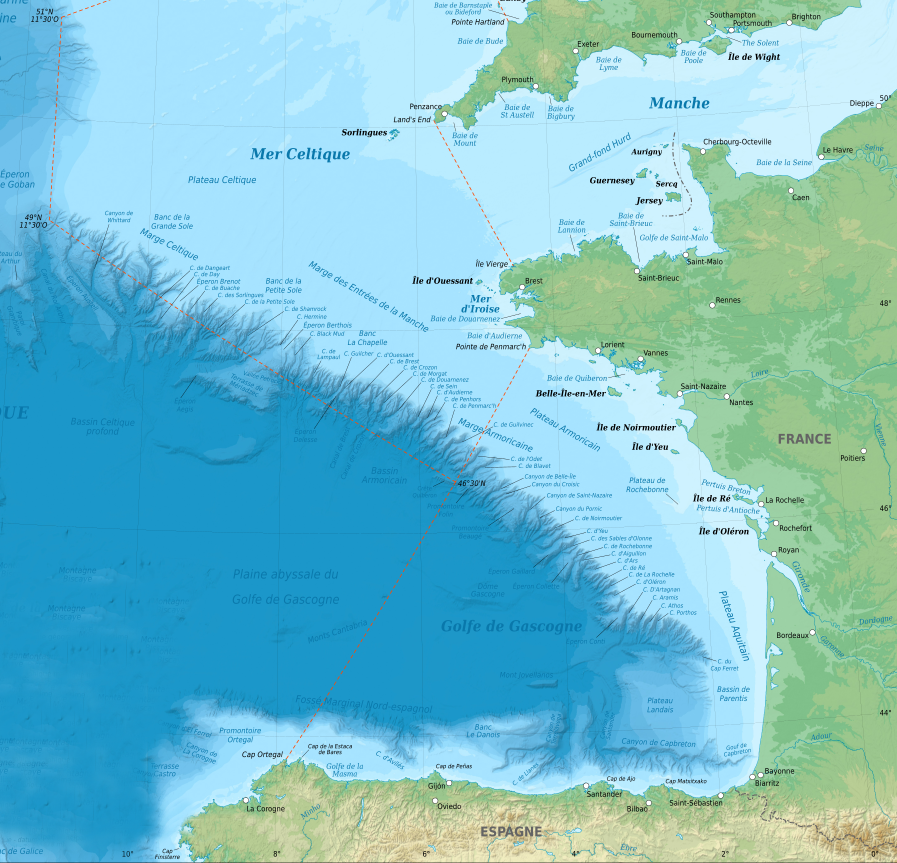 Французский континентальный шельф простирается примерно на 80 морских миль от побережья, глубина воды составляет от 20 до 150 метров. Всего в нескольких морских милях западнее морское дно резко обрывается до глубины более 1000 метров, а затем и до более чем 4000 метров. Выброшенной за борт персиковой косточке потребовалось бы около двух часов, чтобы достичь глубоководного дна.