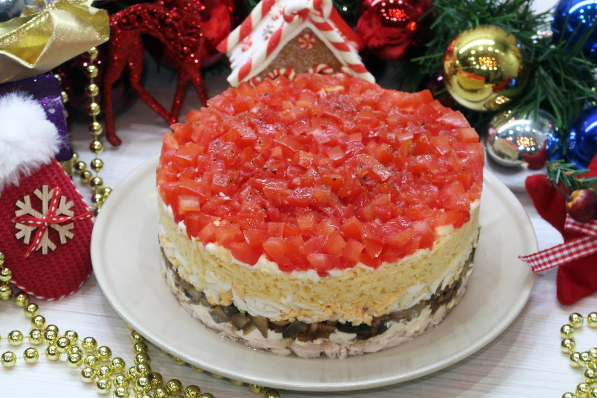 Салат Красная шапочка получается сытным, аппетитным и очень вкусным. Он, несомненно, украсит ваш праздничный стол. Салат «Красная шапочка» в настоящее время известен в разных вариациях. Его готовят с помидорами, сладким перцем и гранатом. Единственное, что объединяет все эти рецепты — это пестрая верхушка блюда, которая, оправдывая название, непременно должна быть ярко-красной. Готовится такой салат очень просто и быстро. Такой салат можно подать в большом праздничном салатнике или формировать в разъёмной форме для выпечки. Обязательно украсьте им свой новогодний стол! Уверена, что ваши гости и домочадцы оценят этот салат по достоинству. Видео приготовления: https://vkvideo.ru/video-227283412_456239874 Лучше всего салат Красная шапочка собирать в глубоком салатнике или на плоском блюде, укладывая подготовленные ингредиенты слоями. Я буду собирать салат на плоской тарелке с помощью кольца от формы для выпечки, размером 20 см в диаметре. Нежное куриное филе нарезаем на небольшие кусочки