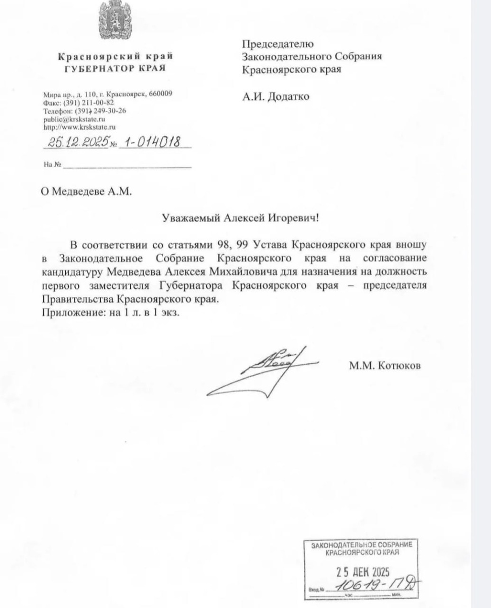 Медведева Напомним, на текущий момент Алексей Медведев временно исполняет обязанности председателя правительства региона, в связи с избранием Сергея Верещагина новым мэром Красноярска. 29 декабря на сессии краевого парламента депутаты рассмотрят этот крайне важный для региона кадровый вопрос. ______ 🔴Оставить обращение ✏️ 🔴Мы в MAX