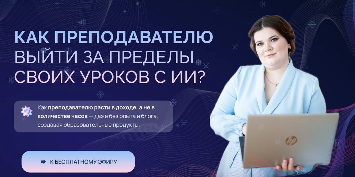 Но в какой-то момент упираются в потолок: по времени, по доходу, по энергии. Проблема здесь не в вас и не в том, что вы «мало стараетесь». Проблема в формате «урок за уроком». Рано или поздно он перестаёт масштабироваться. ИИ сейчас даёт преподавателю возможность выйти за пределы уроков: — готовиться быстрее, — выстраивать систему, — упаковывать свою экспертизу, — зарабатывать не только часами, но и образовательными продуктами. Я проведу эфир «Как преподавателю выйти за пределы своих уроков с ИИ» - с реальными вариантами для учителей и репетиторов. Если вам это откликается и вы хотите попасть на эфир, переходите по ссылке: https://teacheril.ru/ai-proriv