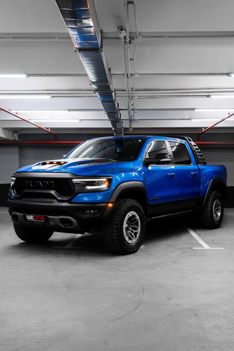 RAM 1500 TRX с мотором Hellcat на 6.2 л и 702 л.с. Его берут, потому что внутри что-то щелкает. Особенно, когда видишь, что это 2022 год и пробег всего 8.090 км. Зверя только выпустили из клетки. Под капотом тут компрессорный V8 Hellcat, еще раз повторимся, 6.2 л на официальные 702 л.с. и разгоном до сотни примерно за 4.5 с. Для пикапа супер цифры. Цвет — синий металлик, который делает машину заметной на полгорода. Внутри это не рабочий пикап, а очень даже премиум: черная кожа, пакет TRX Carbon Fiber, спортивный руль с кожей и карбоном, карбоновые вставки по панели. Все сиденья с подогревом и вентиляцией, двухзонный климат, память сиденья водителя, панорама, черный потолок и аудиосистема Harman/Kardon. По оснащению тут полный набор: блокировка дифференциала, режимы движения, система помощи при спуске, управление тормозами прицепа, адаптивный круиз, контроль слепых зон, давление в шинах, камера 360 и зеркало с видеопотоком. Плюс Apple CarPlay, проекционный дисплей, Rambar за кабиной.