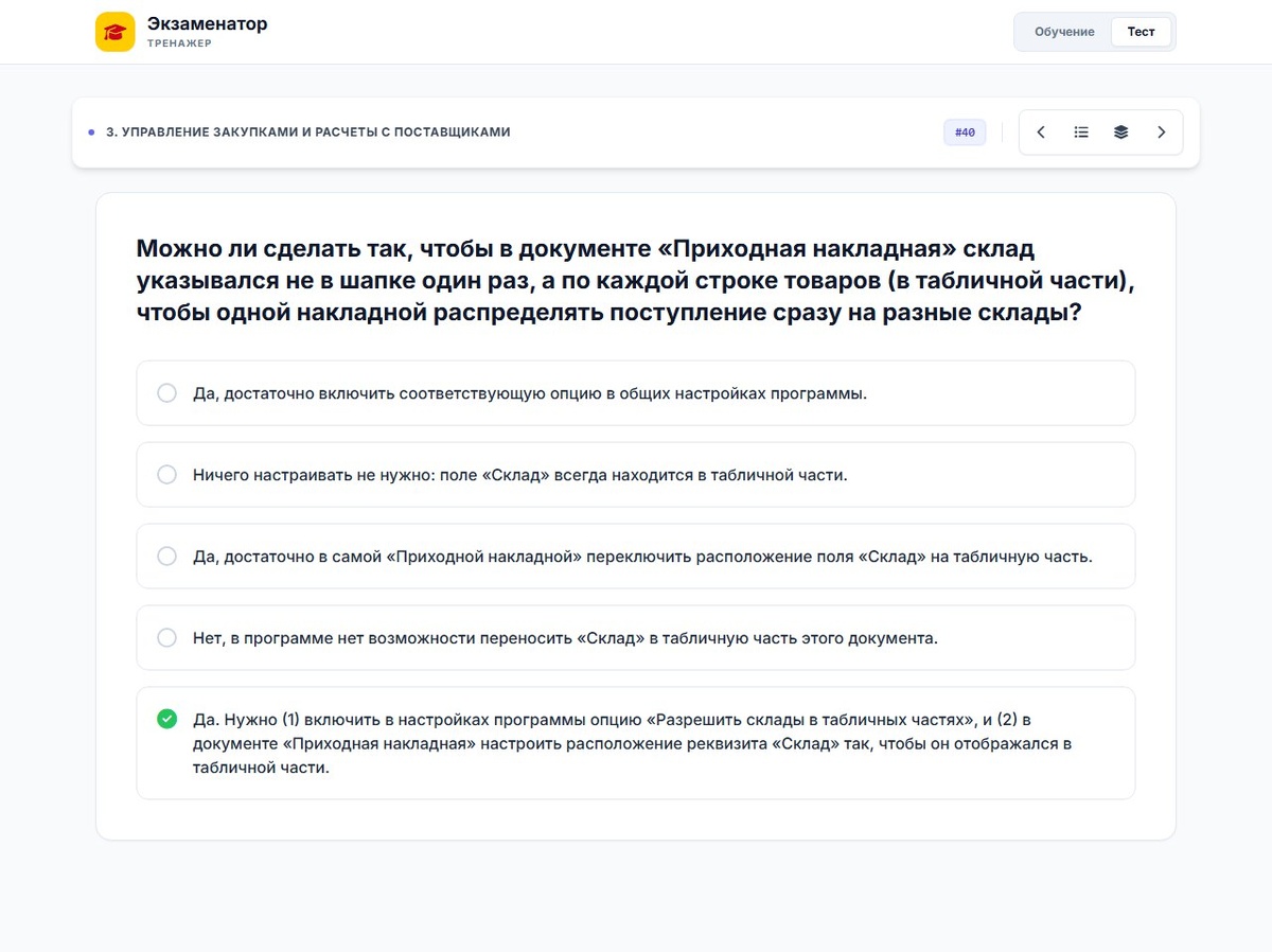 табличной части), чтобы одной накладной распределять поступление сразу на разные склады? 1️⃣ Да, достаточно включить соответствующую опцию в общих настройках программы. 2️⃣ Ничего настраивать не нужно: поле «Склад» всегда находится в табличной части. 3️⃣ Да, достаточно в самой «Приходной накладной» переключить расположение поля «Склад» на табличную часть. 4️⃣ Нет, в программе нет возможности переносить «Склад» в табличную часть этого документа. 5️⃣ Да. Нужно (1) включить в настройках программы опцию «Разрешить склады в табличных частях», и (2) в документе «Приходная накладная» настроить расположение реквизита «Склад» так, чтобы он отображался в табличной части. ✅ Правильный ответ: 5️⃣ #1С #Тест #Бухгалтерия #Обучение Хотите больше вопросов? Переходите на сайт https://infotest.mywebguide.ru/
