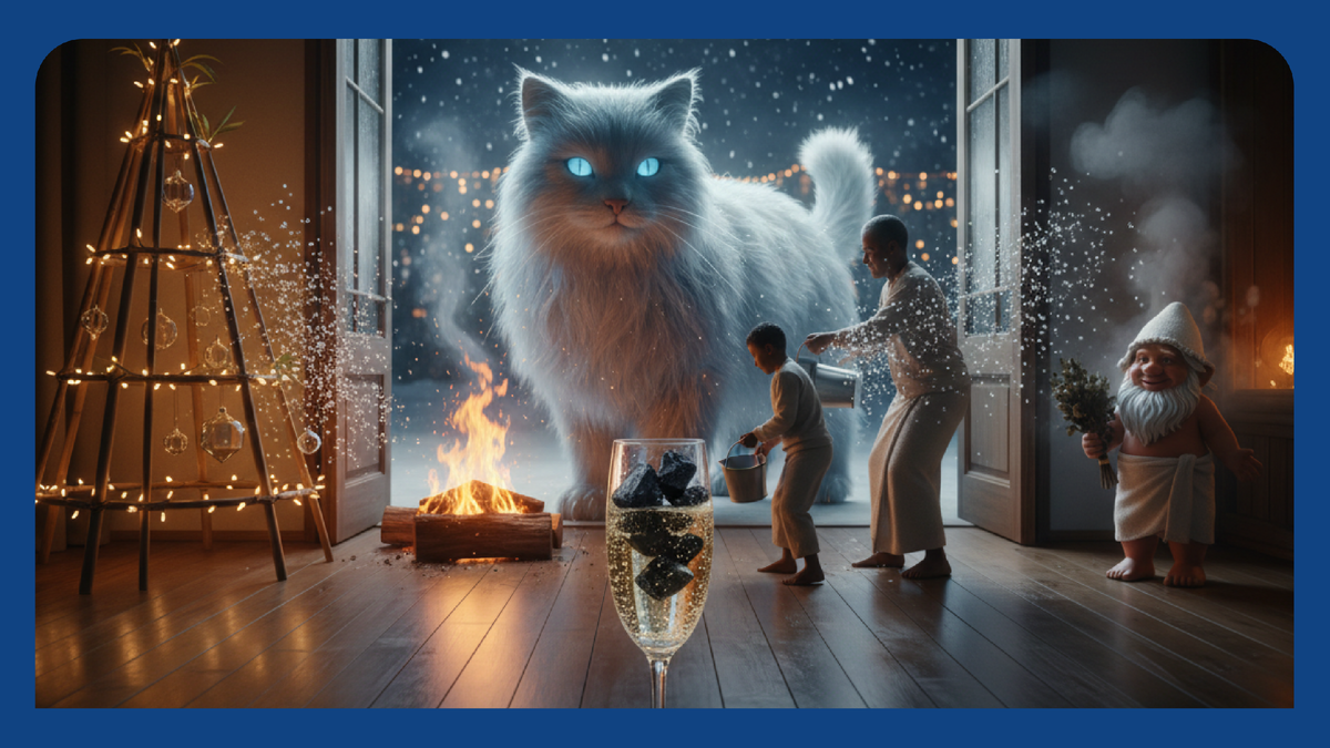 Пока мы привычно зажигаем бумажки с желаниями под бой курантов и смотрим Иронию Судьбы, кто-то выливает воду из всех кастрюль за порог, кто-то кормит кашей невидимого гнома, а кто-то и вовсе несёт уголь в гости. А нас ведь оливьешкой не корми, дай о теплоснабжении поговорить. Вот и решили мы под Новый год рассказать о самых необычных традициях связанных с теплом. Финны подходят к Рождеству серьёзно. Накануне праздника обязательно топят баню — причём попариться должна вся семья, пока на улице ещё светло. Но самое интересное начинается потом. В сауне принято сидеть тихо. Совсем тихо. По поверью, если нашуметь в рождественской бане, летом замучают комары. А ещё финны оставляют в сауне тарелку рисовой каши и пиво. Для кого? Для Saunatonttu — банного гнома, который охраняет дом весь следующий год. Представьте: 3 миллиона саун на 5,5 миллионов жителей. Это почти вся страна может париться одновременно, угощая невидимых духов. Кстати, исторически сауна была первым, что строили финны на новом м