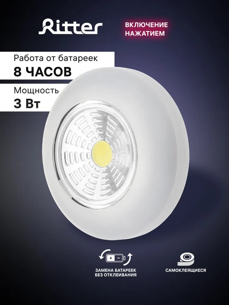 Светильник светодиодный на батарейках, подсветка в шкаф, белый, Ritter