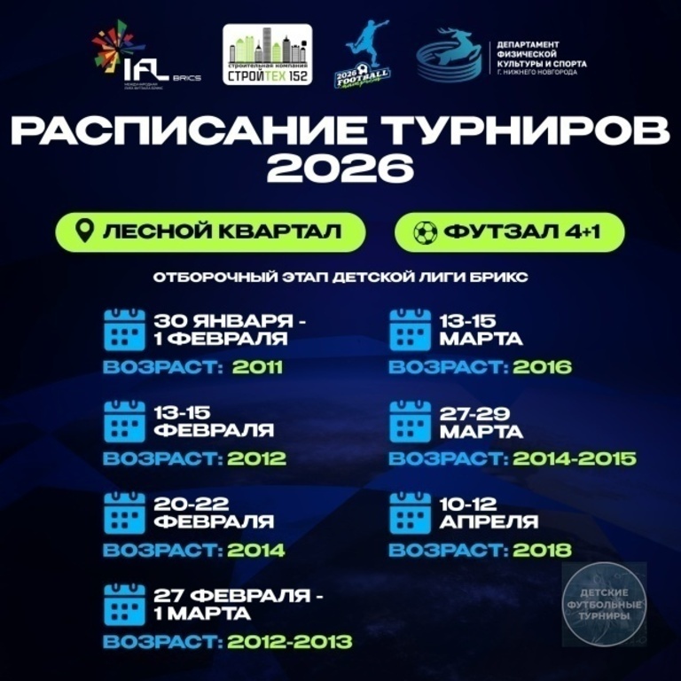 ! Напоминаем, что все турниры Football Champion проходят в рамках отборочного этапа детской лиги БРИКС, а по итогам отбора лучшие команды получают возможность принять участие в финальном турнире в Москве. Даты: 30 января-12 апреля (подробнее на картинке) Возрастные категории: от 2011 до 2018 года рождения Локация: ГТК «Лесной квартал», Зелёный город На турнире вас ждут: – профессиональные фото- и видеосъемка, – аккредитированный судейский корпус, – награждение всех команд и лучших игроков в каждом коллективе, – подарки от наших партнеров, – развлекательная программа. Подать заявку: vk.cc/cSwWt7 Забронировать место: 8 (910) 102-90-04, Павел Николаевич Лачугин vk.com/id20665482 www.Pashu.lachugin@yandex.ru -— #ФутбольныйТурнирЯнварь2026 #ФутбольныйТурнирФевраль2026 #ФутбольныйТурнирМарт2026 #ФутбольныйТурнирАпрель2026 #ФутбольныйТурнирЦентральнаяРоссия2026 #ФутбольныйТурнирНижнийНовгород2026 #ФутбольныйТурнирНижнийНовгород2011гр #ФутбольныйТурнирНижнийНовгород2012гр #ФутбольныйТурни