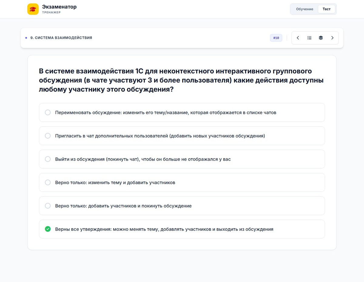 ) какие действия доступны любому участнику этого обсуждения? 1️⃣ Переименовать обсуждение: изменить его тему/название, которая отображается в списке чатов 2️⃣ Пригласить в чат дополнительных пользователей (добавить новых участников обсуждения) 3️⃣ Выйти из обсуждения (покинуть чат), чтобы он больше не отображался у вас 4️⃣ Верно только: изменить тему и добавить участников 5️⃣ Верно только: добавить участников и покинуть обсуждение 6️⃣ Верны все утверждения: можно менять тему, добавлять участников и выходить из обсуждения ✅ Правильный ответ: 6️⃣ #1С #Тест #Бухгалтерия #Обучение Хотите больше вопросов? Переходите на сайт https://infotest.mywebguide.ru/