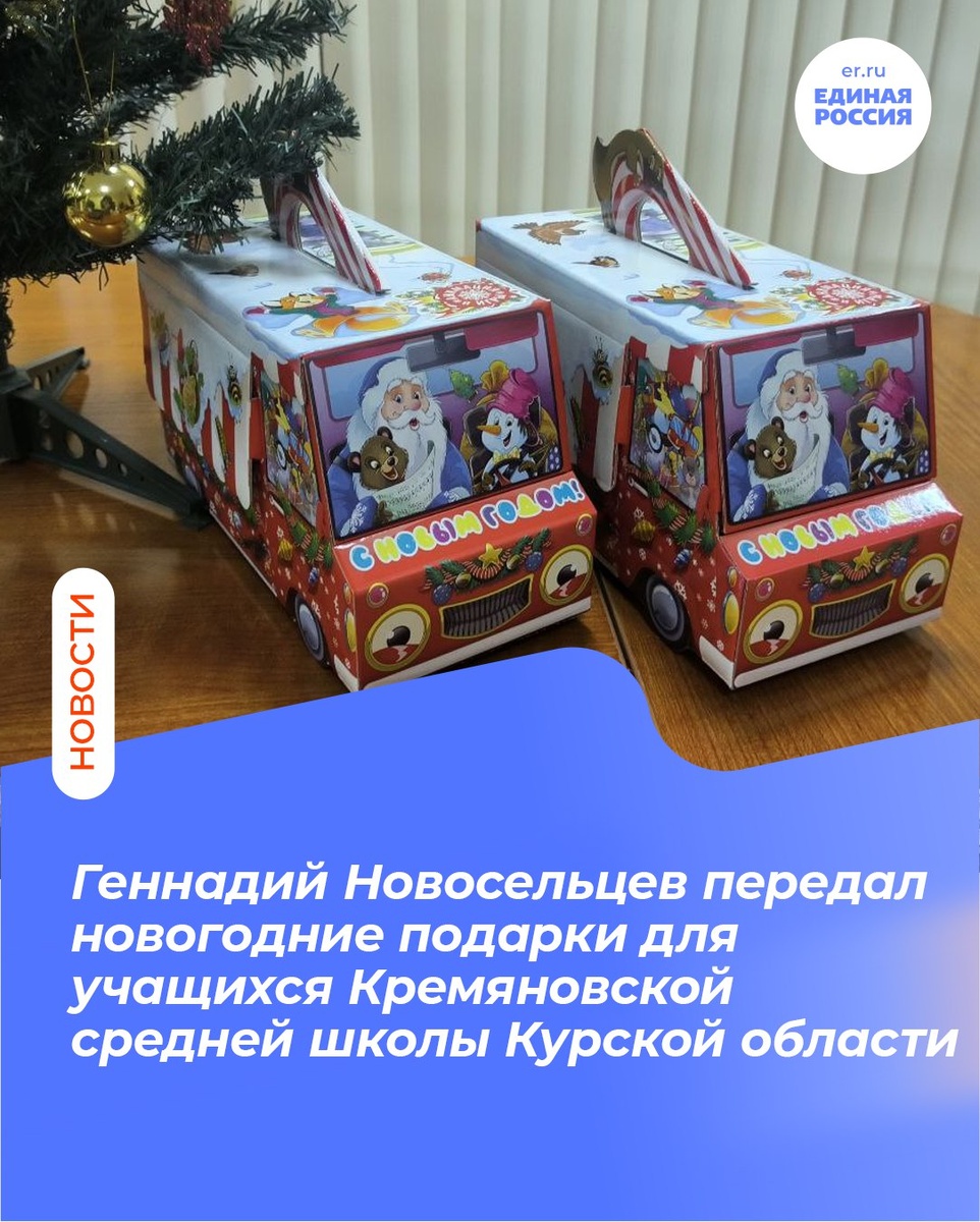 учеников Кремяновской средней школы Кореневского района Курской области и передал им сладкие новогодние подарки. Наступающий новый год ребята будут встречать вдали от своих родных мест. Школьник были вынуждены покинуть разрушенные в результате военных действий дома и находятся на дистанционном обучении в Курске. Несмотря на все сложности, ребята осваивают учебную программу, занимаются творческой деятельностью. Геннадий Новосельцев отметил их трудолюбие, стойкость и выносливость. 🗣- Дорогие друзья! Пусть наступающий новый год принесет все самое лучшее, исполнит ваши мечты и пожелания! Желаю всем вам здоровья, мира и благополучия, хорошего настроения и успешной учебы! Всем нам – одной Победы! – написал председатель. #ЕР40 #ЕдинаяРоссия