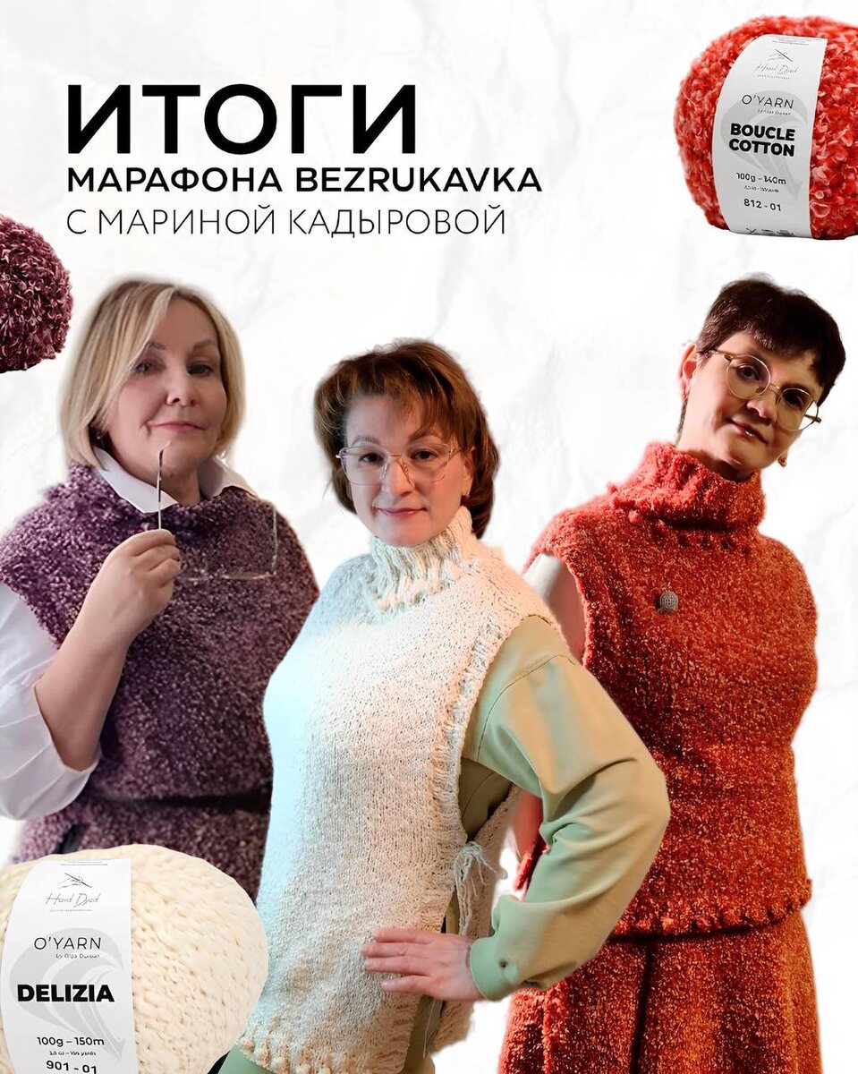 ! Сегодня мы рады объявить победителей в нашем марафоне на BEZRUKAVKA с Мариной Кадыровой 🥰 В этот раз вы просто невероятно постарались, вязали целые костюмы! Креативили, вязали целые комплекты - просто поразили нас! ❤️🔥ГЛАВНЫЕ ПОБЕДИТЕЛИ МАРАФОНА: ✔️ Лейла Дорофеева @dorofeevaleila - Мы все остались в восторге от вашего видеоролика! Единогласно всей командой приняли решение отдать призовое место вам! ✔️ Елена Савиных @elenasavinykh_beauty - Благодарим за ваш подробный отзыв, который не просто об изделии целиком, но также и с обзором на разные образы, которые собираются с жилетом ✔️ Марина Пугачева @pmarina_a - У вас получился волшебный костюм из BOUCLE COTTON! Благодарим за это буйство красок и стиль! Вы получаете каждая корзину пряжи O’YARN на сумму 5 000 рублей! Корзина пряжи будет собрана нами. Благодарим за волшебные фото, ваше изделие и яркое участие! ____ ДОПОЛНИТЕЛЬНЫЕ ПРИЗЫ ОТ НАС - 200гр пряжи O’YARN получают: ✔️ Галина Морозова - за нежный морозный образ @MGN010
