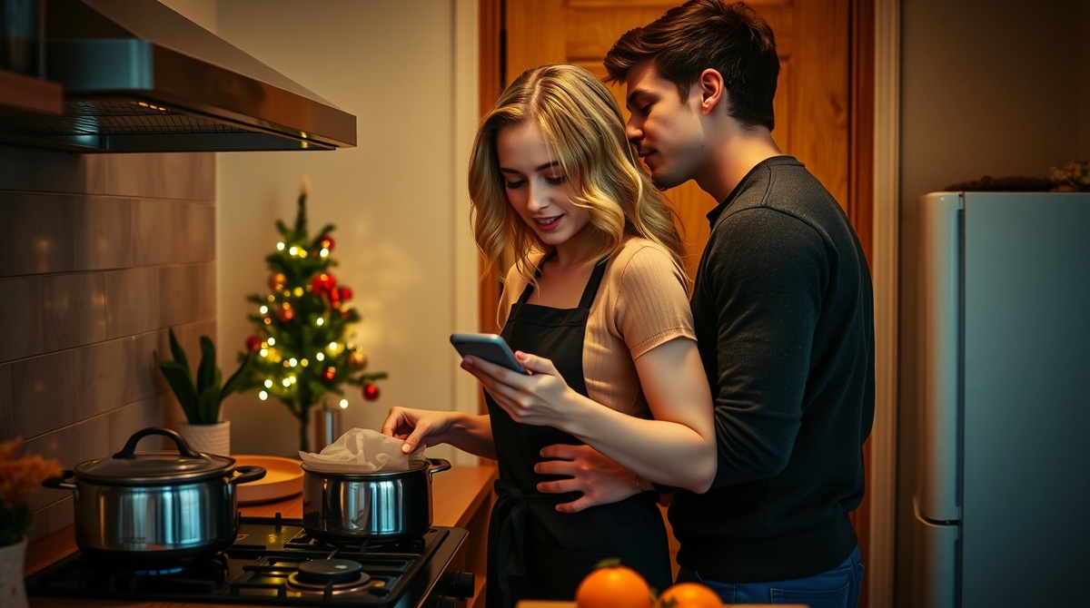 31 декабря. За окном метёт снег, а в маленькой однушке на окраине города пахнет мандаринами и хвоей. Алиса стоит у плиты и нервно помешивает что-то в кастрюле, поглядывая на телефон. На экране — заметки с рецептами, которые мама присылала ей всю неделю.