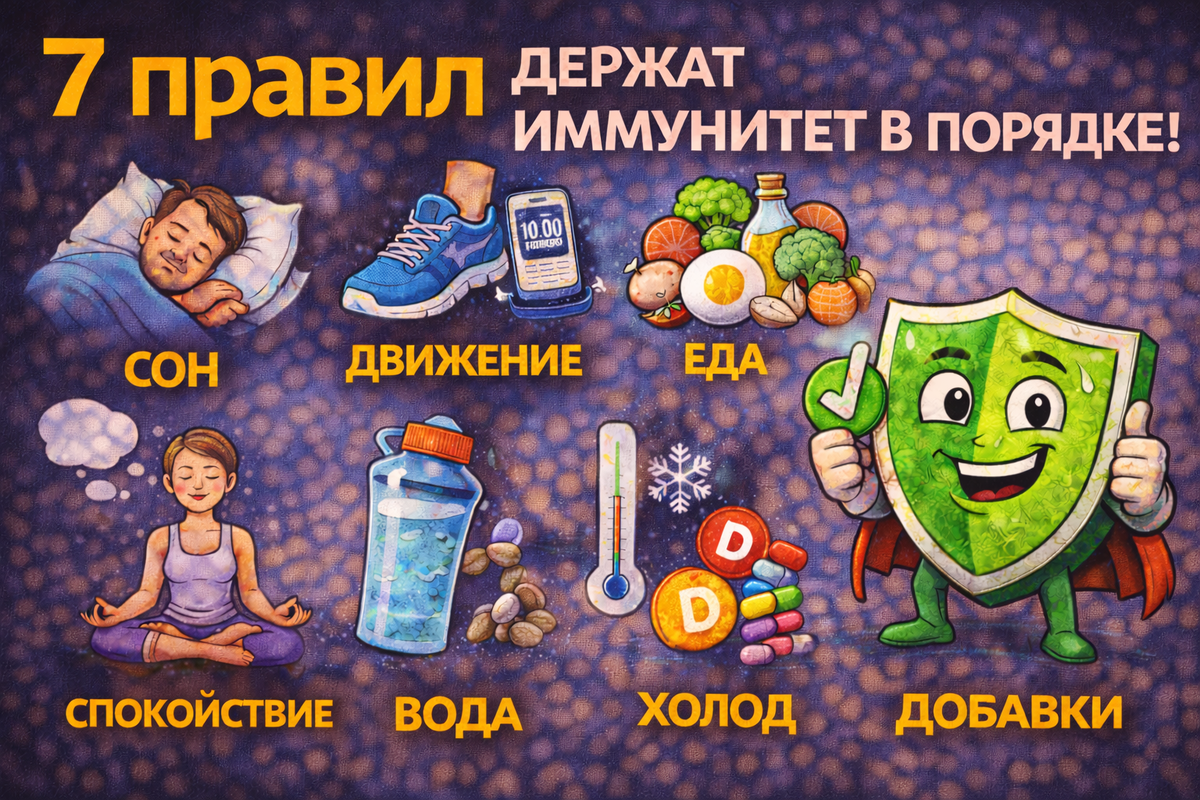 «Иммунитет без секретов» Без таблеток и “волшебных” добавок — только то, что действительно работает Есть странное ощущение, знакомое многим: вроде бы не переохлаждался, не болел, анализы в норме… а организм будто сдался. Простуда цепляется за простудой, усталость не проходит, голова тяжёлая, настроение — на нуле. И тут в ход идёт всё: витамины, иммуномодуляторы, советы из интернета, «проверенные» таблетки от знакомых. Но правда в том, что иммунитет редко падает внезапно. Его тихо подтачивают привычки, которые мы считаем нормой. разберём честно — что действительно поддерживает иммунитет, а что только создаёт иллюзию заботы о здоровье. 🧠 Почему иммунитет — это не таблетка Иммунитет — не кнопка «вкл/выкл». Это сложная система, которая реагирует на: сон, уровень стресса, питание, движение, гормональный фон, режим твоего дня, даже на мысли и усталость. И так что его нельзя “поднять за 3 дня”. Но можно стабилизировать — если действовать умно. ✅ 7 правил, которые действительно работают Сон —