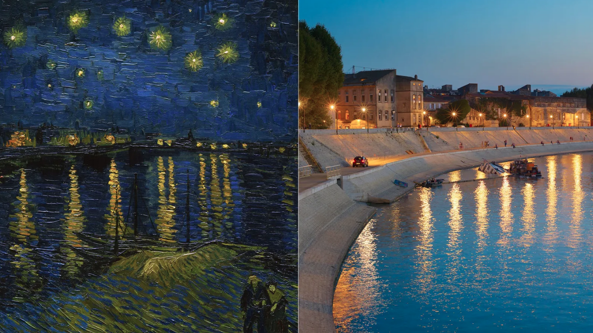 Любители искусства могут догадаться, что место, изображенное Ван Гогом на его культовой картине «Звездная ночь над Роной» (1888), он часто посещал, поскольку оно находилось примерно в 150 метрах от Желтого дома, дома художника во время его пребывания в Арле. Картина была написана в период творческого подъема художника, всего за несколько месяцев до нервного срыва, который завершился ампутацией уха и помещением его в психиатрическую лечебницу в Сен-Реми, Франция. Однако перед этим Винсент в письме своему младшему брату Тео подытожил суть своей знаменитой картины: «Вкратце, это звездное небо, написанное ночью, фактически под газовой горелкой. Небо аквамариновое, вода — королевского синего, земля — сиреневого. Город — синий и фиолетовый. Газ — желтый, а отражения — рыжевато-золотые, переходящие в зелено-бронзовый. На аквамариновом фоне неба Большая Медведица — сверкающая зеленая и розовая, чья сдержанная бледность контрастирует с грубым золотом газа. На переднем плане — две красочные фигурки влюбленных».