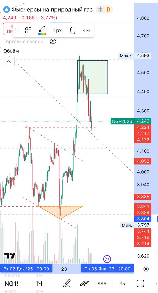 Апдейт по газу. После хорошего выноса позавчера, и короткого шортсквиза вчера (быстрый вынос наверх с ликвидацией шортовых позиций), рынок начал выдыхать. Технически, мы увидели вчера ретест и мясных максимумов. Опционный интерес переместился в область 4,3-4,5-4,8, что говорит о локальной смене настроений в сторону бычьих. Сегодня, в европейскую сессию, торгуется только фьюч на нашей бирже, причем в позитивном ключе. Свои длинные позиции после фиксации 70% лонга позавчера, вчера я восстановил.