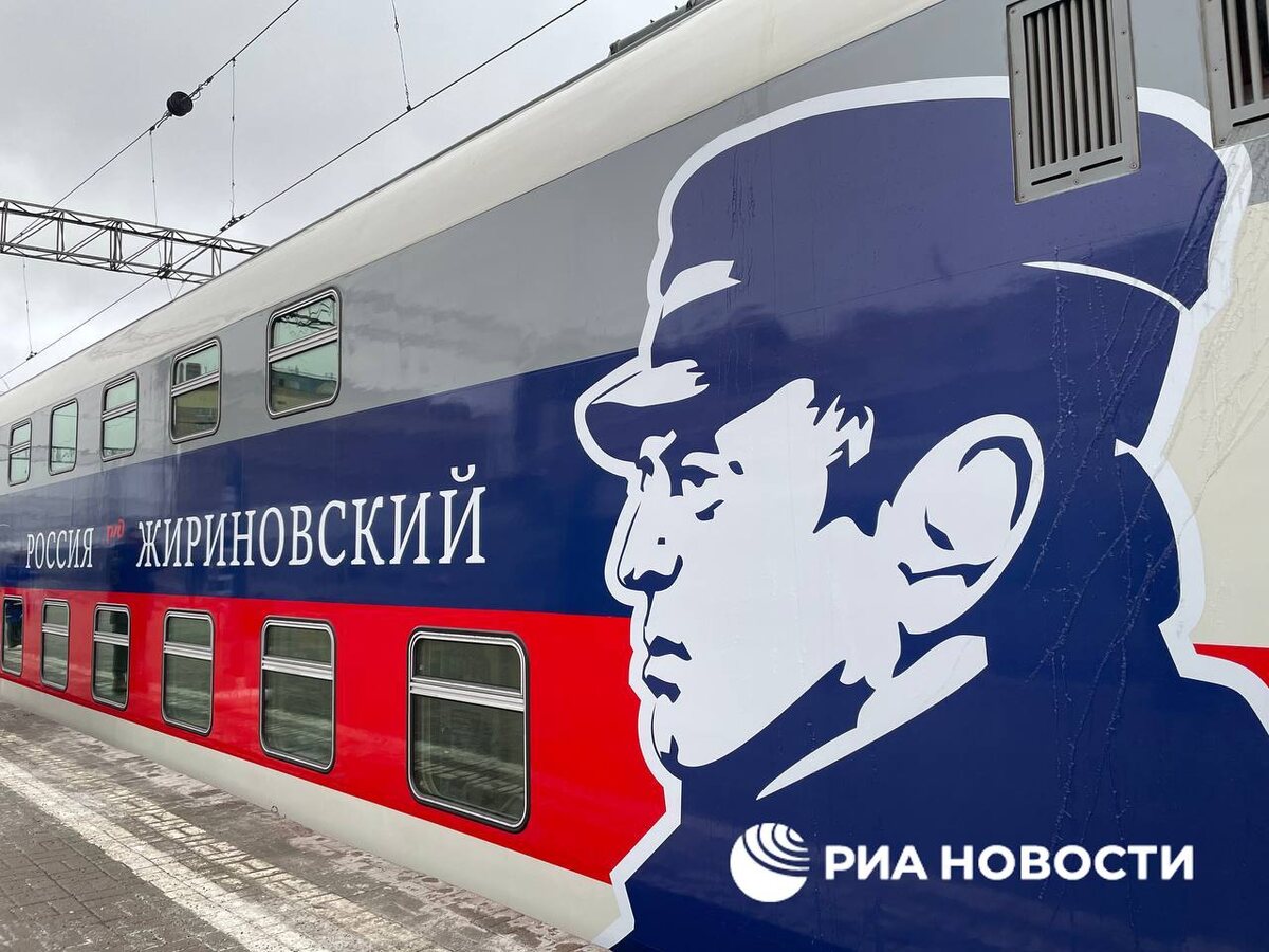 Поезд с брендированным вагоном "Россия. Жириновский", посвященным 80-летнему юбилею основателя партии ЛДПР, отправился с Казанского вокзала.