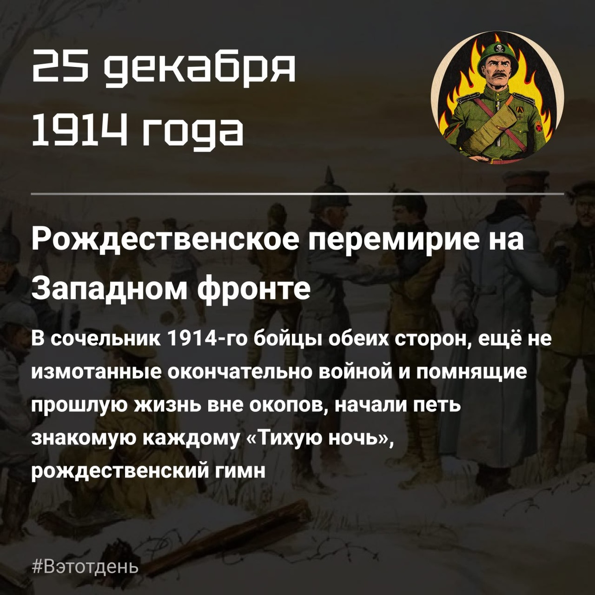 В канун католического Рождества состоялось негласное перемирие на Западном фронте. Оно произошло в Бельгии, в районе печально известного города Ипр. В сочельник 1914-го бойцы обеих сторон, ещё не измотанные окончательно войной и помнящие прошлую жизнь вне окопов, начали петь знакомую каждому «Тихую ночь», рождественский гимн, написанный в 1818 году священником Йозефом Мором и школьным учителем Францем Грубером. Солдаты воспользовались передышкой, для того чтобы собрать и похоронить тела убитых. Так что, вряд ли они питали иллюзии о том, что это братское единение врагов что-то изменит. Вот что пишет в своих воспоминаниях военный врач из Уэльса капитан Данн: «В 8.30 я трижды выстрелил в воздух и вывесил флаг с надписью «Счастливого Рождества». Я выбрался на насыпь и увидел с немецкой стороны полотнище, на котором было написано «Спасибо». Там появился немецкий капитан, мы оба поклонились, отсалютовали друг другу и вернулись в окопы. Он дал два выстрела в воздух, и война началась снова»