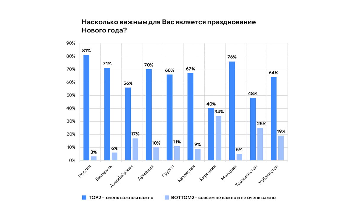 Согласно результатам исследования, 61% респондентов отметили, что Новый год имеет для них высокую или очень высокую значимость. При этом высокий уровень значимости (объединяющий категории "очень важен" и "важен") наблюдается не только во всех опрошенных странах, но и среди всех возрастных групп.