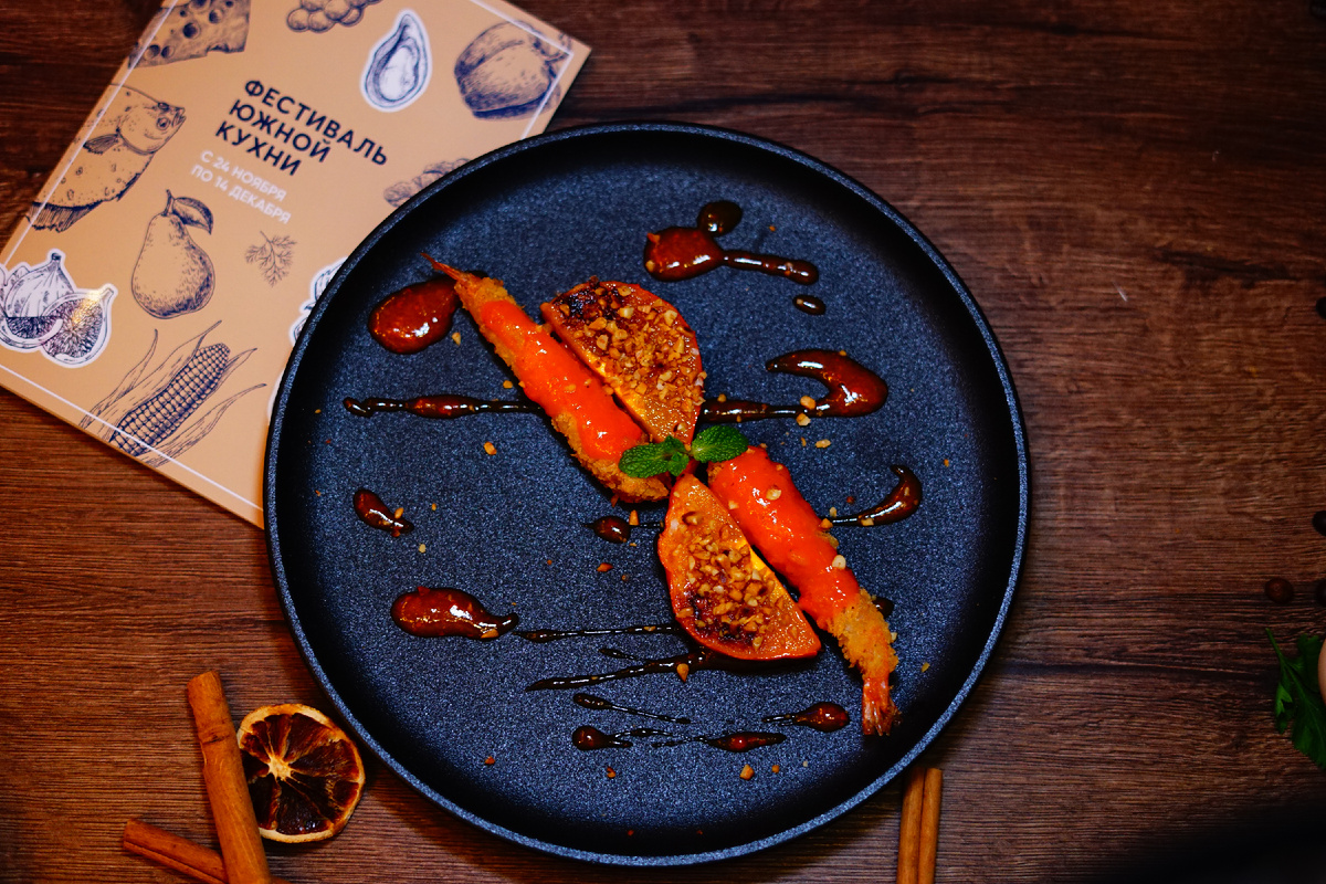 Праздники прошли, а значит, пришло время возвращаться к правильному питанию. Тем более, что во второй половине января организм как никогда жаждет легкости. Если при этом все-таки не хочется от ярких и запоминающихся блюд, можно приготовить креветки с запеченной хурмой, медом и грецкими орехами, которые шеф-повар Денис Юрьев предлагал гостям сочинского ресторана «Мидийный дом» в сете к Фестивалю южной кухни. Основные ингредиенты: Панировка Соус Подготовка креветок: креветки необходимо разморозить, промыть и обсушить. Каждую креветку необходимо растянуть (слегка разрезать по брюшку или просто расправить, чтобы она была прямой), посолить и поперчить тонким слоем. Оставить на 5 минут. Запекание хурмы: две хурмы нарезать дольками или крупными кубиками, выложить на противень, полить 1,5-2 столовыми ложками меда, запекать при 180°C 12–15 минут, до легкой карамелизации. Соус из хурмы: в блендере перебить мякоть 1 хурмы, 1 ст.л. меда, 2-3 ч.л. шрирачи. При необходимости добавить пару ложек воды
