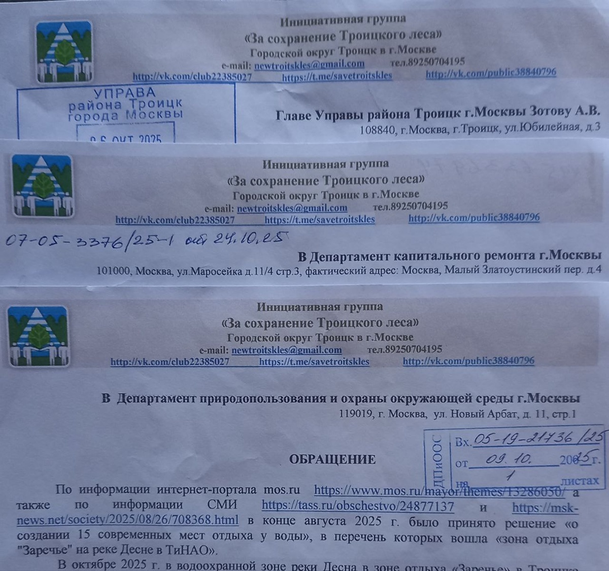 В октябре Инициативная группа "За сохранение Троицкого леса" направила запросы о предоставлении информации по данному проекту в Управу, в