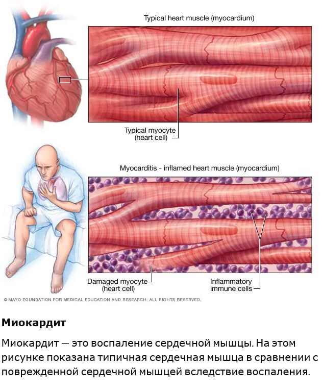 Миокардит — это воспаление сердечной мышцы, называемой миокардом. Это заболевание может снизить способность сердца перекачивать кровь. Миокардит может вызывать боль в груди, одышку и учащенное или нерегулярное сердцебиение.