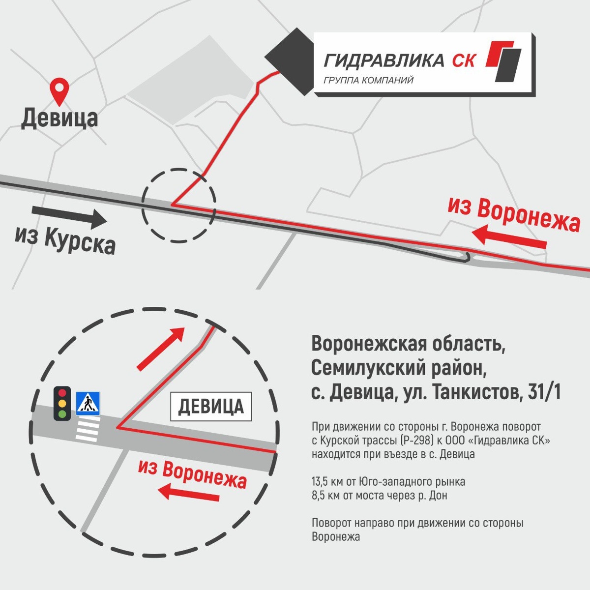 ! Обращаем ваше внимание, что компания "Гидравлика СК" в Воронеже переехала! Теперь мы находимся по адресу 👉 Воронежская обл., Семилукский р-н, с. Девица, ул. Танкистов, 31/1. В строительство новых цехов мы вложили много сил, времени и ресурсов. И теперь рады предложить вам совершенно иной масштаб возможностей и производственной мощности! 💪 Мы обязательно все подробно вам расскажем и покажем в новом году, а пока - не теряйте нас и сохраните небольшую шпаргалку со схемой проезда к нашему новому месту работы 🚘 📞8 800 550 36 36