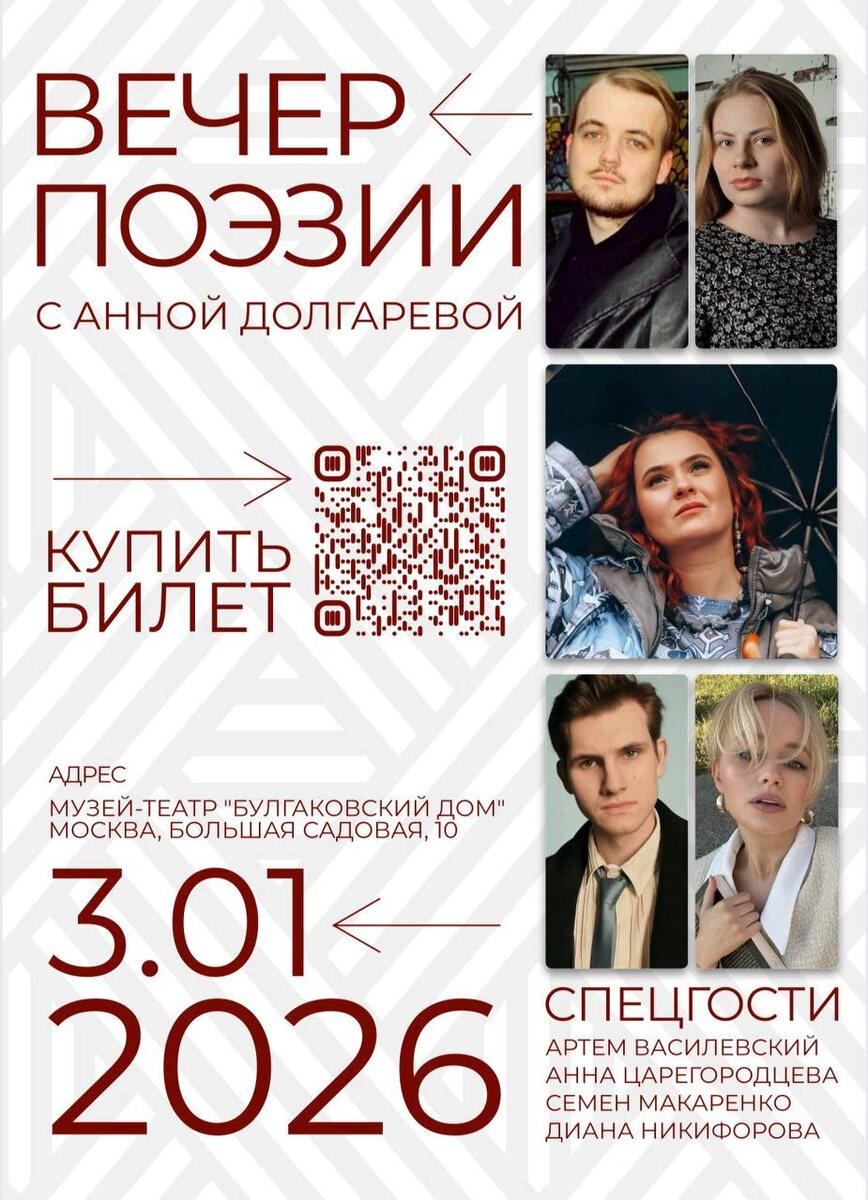 ! 3 января музей-театр «Булгаковский Дом» распахнет свои двери для литературного события начала года: вечера поэзии с Анной Долгаревой. Вместе с Анной выступят талантливые поэты: • Артем Василевский • Анна Царегородцева • Семен Макаренко • Диана Никифорова Мы попадем в атмосферу вдохновения, волшебства и живого слова. Не упустите возможность стать частью этого уникального литературного вечера! Билеты приобретайте по ссылке: https://clck.ru/3QyMAu Дата и время: 3 января, 19:00 Место: музей-театр «Булгаковский дом», ул. Большая Садовая, 10
