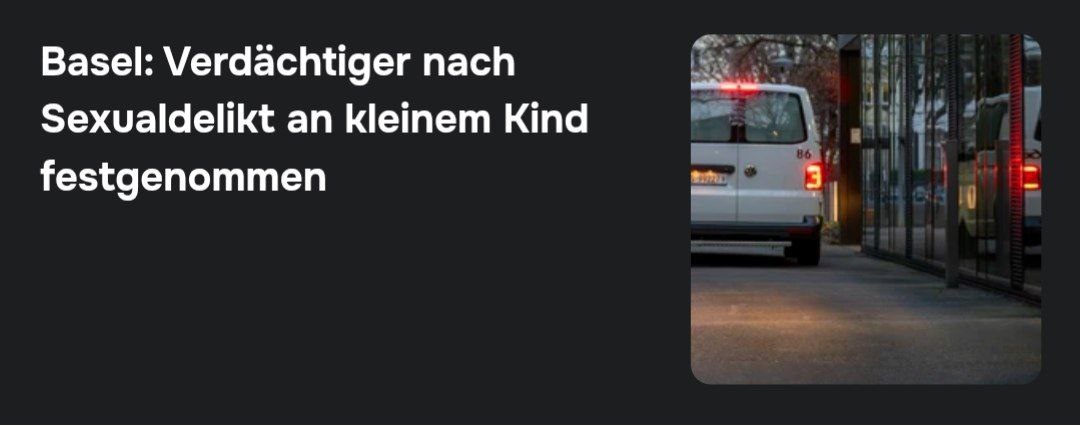 В прошлый четверг мужчина, как предполагается, совершил сексуальное действие в отношении пятилетнего ребенка в районе Околампадматте. Суд по принудительным мерам назначил 30-летнему швейцарцу шесть недель предварительного заключения, сообщила прокуратура Базеля. В отношении арестованного действует презумпция невиновности. Подозреваемый, как предполагается, совершил преступление 18 декабря, вскоре после 12:00. Лица, которые могут предоставить полезную информацию, просят связаться с криминальной полицией или полицией, говорится в сообщении. Полиция особенно заинтересована в видеозаписях, сделанных в районе предполагаемого маршрута побега преступника на улицах Colmarerstrasse, Rufacherstrasse и Türkheimerstrasse между 12:00 и 12:30 " 💬 А разгоняли что это араб был. Были бы камеры наблюдения, не пришлось бы к населению за доками обращаться. Кстати, по любимому правилу 🇨🇭 снимать человека без его разрешения запрещено, камеры частные ставить где попало и как попало - тоже 🫡