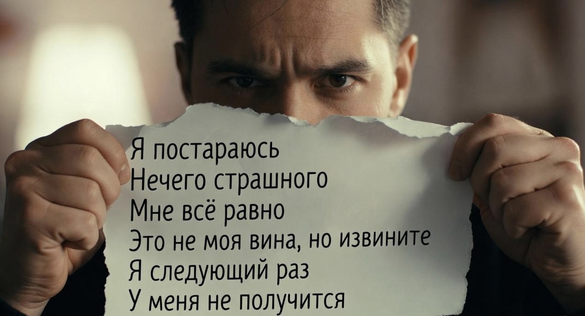 - «Это не моя вина, но извините» Классика людей с низкой самооценкой. Вы берёте чужую ответственность.Замена: Просто молчание или «Это не моя ответственность». Через 60 дней 82 % перестали быть «удобными» для манипуляторов.