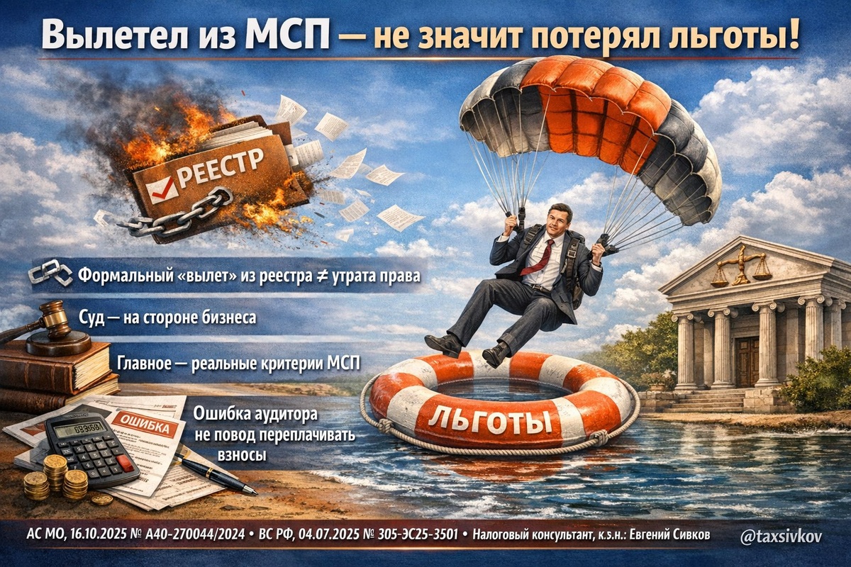 ? Можно ли сохранить пониженный тариф по страховым взносам, если компанию временно исключили из реестра МСП из-за формальной ошибки аудитора? Суд ответил — ДА ✅ ⚖️ Суть дела Средняя компания применяла пониженный тариф взносов как субъект МСП. Но аудиторы с опозданием подали сведения об иностранном учредителе (вместо 1–5 июля — 2 сентября). ➡️ Компанию и её учредителя исключили из реестра МСП, позже вернули. Налоговая отказалась пересчитать взносы: «В реестре не было — льготы нет» ❌ 🏆 Итог спора Суд поддержал бизнес 👏 Главное — фактическое соответствие критериям МСП, а не формальная запись в реестре. Если компания реально отвечает требованиям, пониженный тариф сохраняется, даже при временном «вылете». 🧠 Что важно учесть • Следите за неочевидными причинами утраты статуса МСП • Лимиты выручки: — микро — 120 млн ₽ — малые — 800 млн ₽ — средние — 2 млрд ₽ • В доход включаются ВСЕ поступления, включая дивиденды и проценты 📌 Вывод Формальная ошибка ≠ потеря права на льготу. Но контр