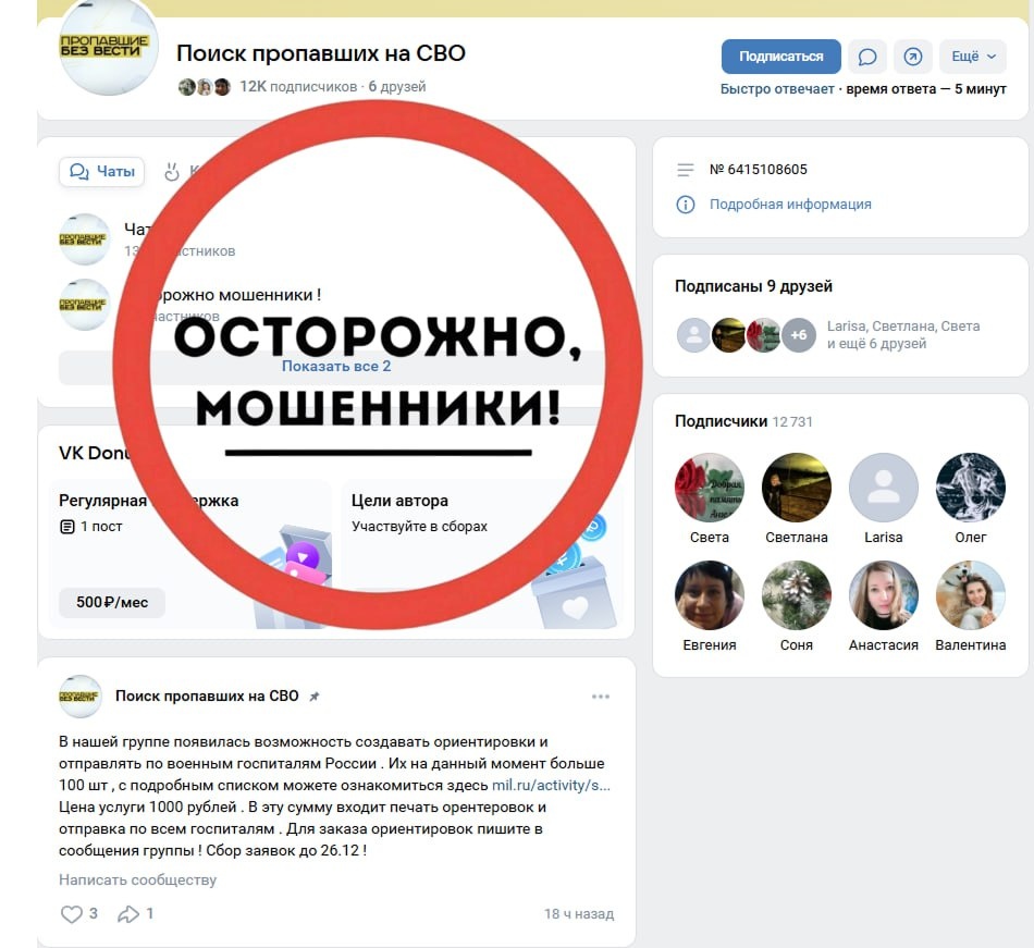 ! 🚨 В социальной сети ВКонтакте продолжает действовать мошенническая группа: https://vk.ru/club224388372. Они под видом услуг по поиску пропавших военнослужащих не только собирают личные данные, но и занимаются сбором денег с родственников бойцов. Вчера, 24 декабря 2025 года, на их странице была опубликована запись с предложение о создании ориентировок для рассылки по госпиталям. Стоимость одной ориентировки составляет 1000 рублей! Мошенники пытаются нажиться на горе и неуверенности людей в таком сложном вопросе, как поиск близких. Обратите внимание, что было добавлено также упоминание официального сайта Министерства обороны Российской Федерации. Однако помните: государственные органы, в том числе Министерство обороны, не взимают деньги за поиск пропавших военнослужащих! Для решения вопроса по поиску пропавших военнослужащих был создан Главный координационный центр в Министерстве обороны, который сосредоточил работу по поиску пропавших бойцов. Будьте бдительны, не доверяйте мошен