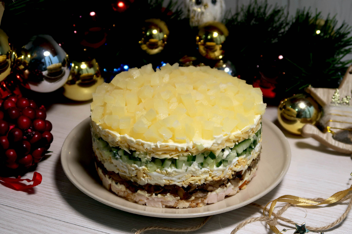 В преддверии Нового года предлагаю приготовить салат Ананасовый рай. Салат Ананасовый рай получается сытным, аппетитным и очень вкусным. Этот салат украсит ваш праздничный стол. Сочное куриное копчёное мясо, грибы, пикантный сыр, воздушные куриные яйца и консервированные ананасы. Оригинальное сочетание обычных продуктов в одном блюде. Готовится такой салат очень просто и быстро. Этот салат можно подать в большом праздничном салатнике или формировать в разъёмной форме для выпечки. Обязательно украсьте им свой новогодний стол! Уверена, что ваши гости и домочадцы оценят этот салат по достоинству. Видео приготовления: https://vkvideo.ru/video-227283412_456239875 Нежное куриное филе нарезаем на небольшие кусочки и выкладываем первым слоем. Сверху делаем сетку из майонеза. Лук репчатый нарезаем на небольшие кубики. Шампиньоны нарезаем на произвольные кусочки. На сковороде разогреваем растительное масло и выкладываем репчатый лук и грибы. Обжариваем до мягкости и лёгкого зарумянивания около