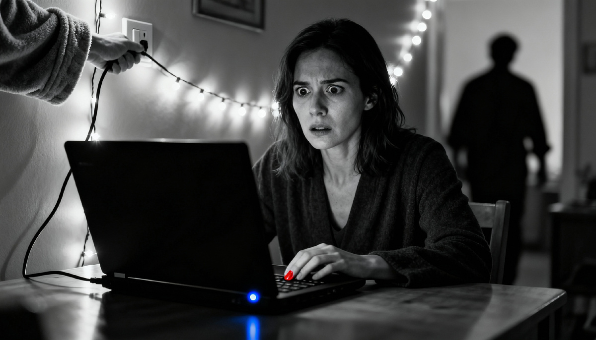 Она посмотрела на меня. Не на меня — сквозь меня. Как на пустое место, которое мешает проходу. И её рука потянулась не ко мне, не к ноутбуку. К розетке. К синему выключателю на удлинителе.