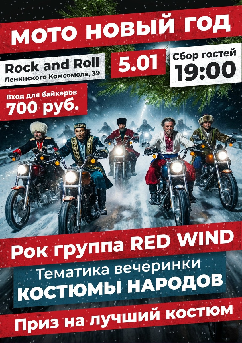 🏍️ 🎸 ROCK and ROLL bar Abakan 🎸 ( Л.Комсомола 39 ) 05.01.2026 ❄️- Начало в 19:00 ☃️- Байкерам Вход - 700 руб ⛄️Выступают: 🎸- Группа Рок-Группа Red Wind 🎁 - Призы за лучшие народные Костюмы🍾 В программе как всегда много музыки много потешных конкурсов🎁 Зажигательные веселые ведущие 🎙️и кое какие Сюрпризы, ну и конечно же «Пиво...Деффки ... Рок н Ролл Так же все кто понимают что бы занять лучшее места, лучше предварительно забронировать себе столики, а так же сделать предзаказ что бы не сидеть голодным и ждать часа полтора заказ...!!!!! Тел. Бронирования - 20-20-20
