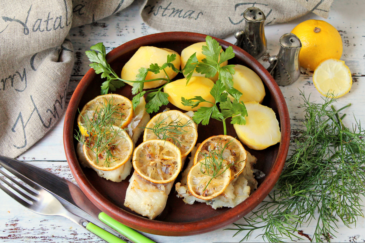 Запечённая треска с лимоном и травами + тушёная брокколи в сливочном соусе (на кокосовом молоке)
