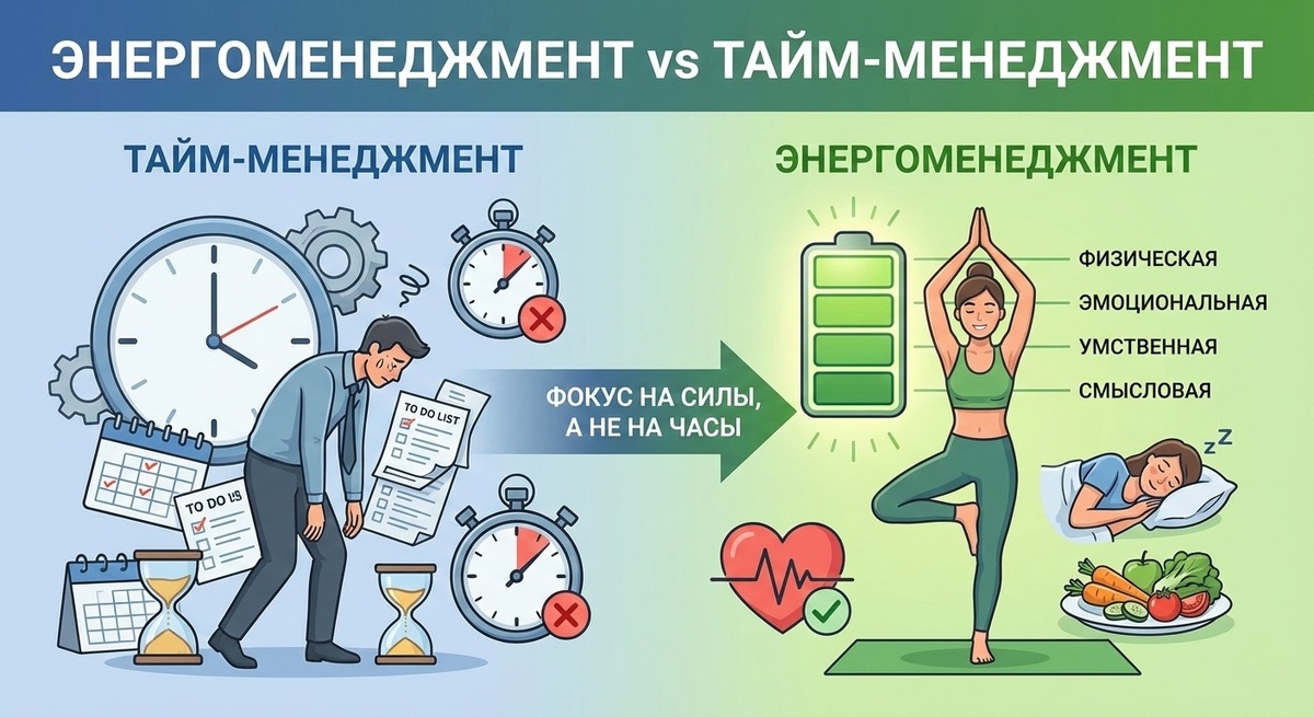 Управление энергией (энергоменеджмент) — это подход, при котором вы планируете не часы, а уровень своей продуктивности.