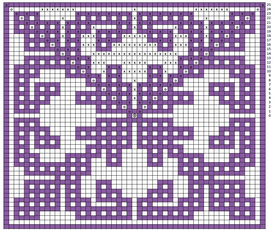 Обычно, разработку схем для квадратных мотивов в мозаичной технике вязания крючком, я начинаю с составления центрального узора, а затем уже определяюсь с размером самой схемы и заполняю остальные пустующие области квадрата. Частенько, также начинаю делать схемы с углового узора, то есть составляю схему для одной четверти квадрата, и затем просто поворачиваю узор по кругу, и если при этом получается красивая серединка, оставляю всё без изменений. Так вышло и с этим данным узором, схема в итоге получилась размером 25 рядов. Затем решила увеличить схему до 31 ряда, для этого я обычно делаю дополнительный ряды, просто продолжая рисовать узор по краям схемы. Но в этот раз я сделала то, что наверное никогда и не делала: я расширила схему путём разъединения угловых элементов и добавления в центр мозаичного узора в виде ромба, при этом стороны слегка как бы скругляла внутрь этого ромба. Обе схемы сделала в двух вариантах в зависимости от техники вязания: первый вариант - полностью в «вафельн