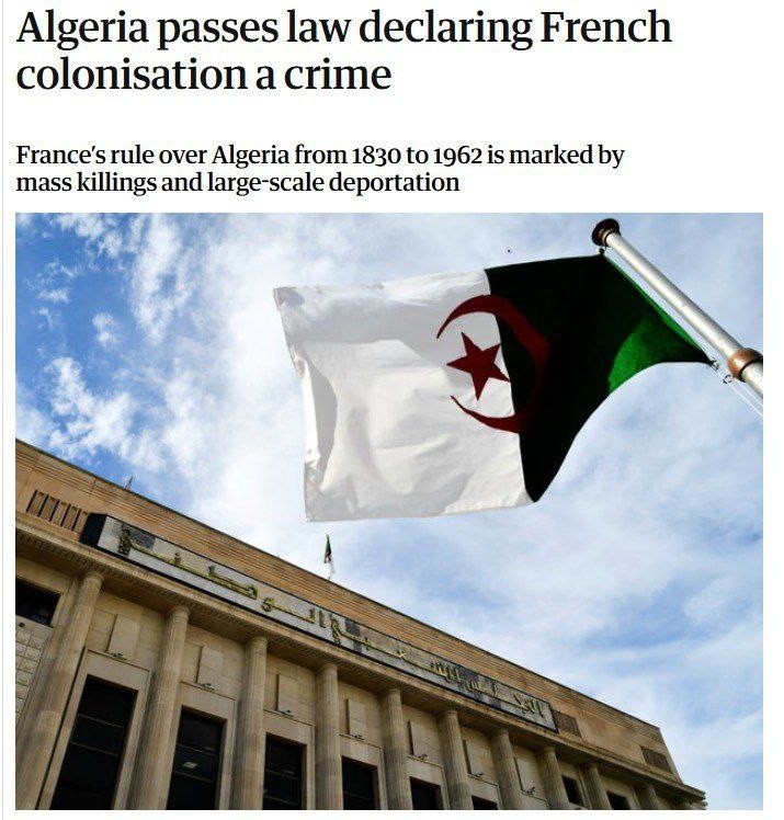 Парламент страны единогласно одобрил такой законопроект. Согласну документу, колониальная политика, которую Франция проводила в период с 14 июня 1830 года и до 5 июля 1962 года, объявлена преступной. Алжир будет добиваться от Парижа официальных извинений и выплаты компенсаций. Авторы закона выделили порядка 30 видов преступлений французского колониализма в Алжире: внесудебные расправы, жестокие пытки местного населения, похищение людей, изнасилования, использование запрещенного оружия, провоцирование экологических катастроф, в том числе проведение ядерных испытаний в алжирской Сахаре, последствия которых местные жители ощущают до сих пор. Также закон предполагает уголовное наказание за любые формы оскорбления национальной памяти и оправдание французского колониализма. Нарушителям грозит от 5 до 10 лет тюрьмы @infostreams