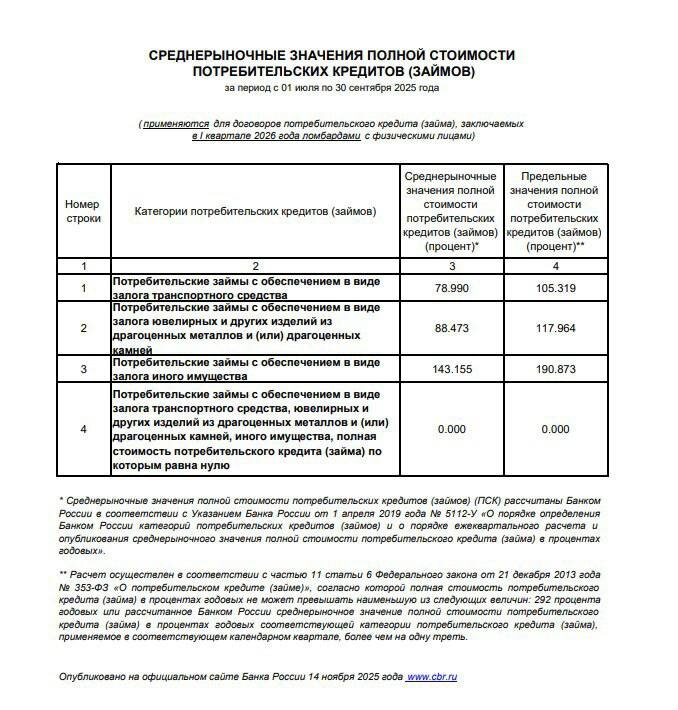 С 01.01.2026 года размер предельной полной стоимости займа (ПСК) в ломбарде составляет: Для потребительских займов под залог ювелирных и других изделий из драгоценных металлов - 117,964 % годовых Для потребительских займов под залог транспортного средства - 105,319 % годовых Для потребительских займов под залог иного имущества - 190,873 % годовых Раздел "Среднерыночные значения полной стоимости потребительского кредита (займа)": https://cbr.ru/statistics/bank_sector/psk/ Справочно: Максимальная допустимыя дневная ставка в ломбардах 0,8% в день. Максимальная сумма единовременной задолженности заемщика по процентам - 130% от суммы займа Подпишитесь на «Ювелир и закон» в Telegram | ВКонтакте | Дзен | Сетка