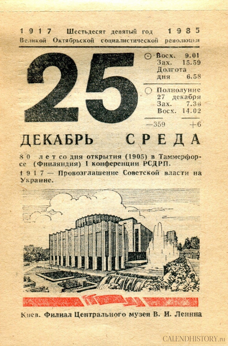 25 декабря 1985-го года — Календарь Политиздата 80 лет со дня открытия (1905) в Таммерфорсе (Финляндия) I конференции РСДРП. 1917 — Провозглашение Советской власти на Украине. Киев. Филиал Центрального музея В. И. Ленина Больше старых советских отрывных календарей смотрите у нас на сайте - calendhistory.ru https://calendhistory.ru/25-dekabrja-1985-go-goda-kalendar-politizdata/