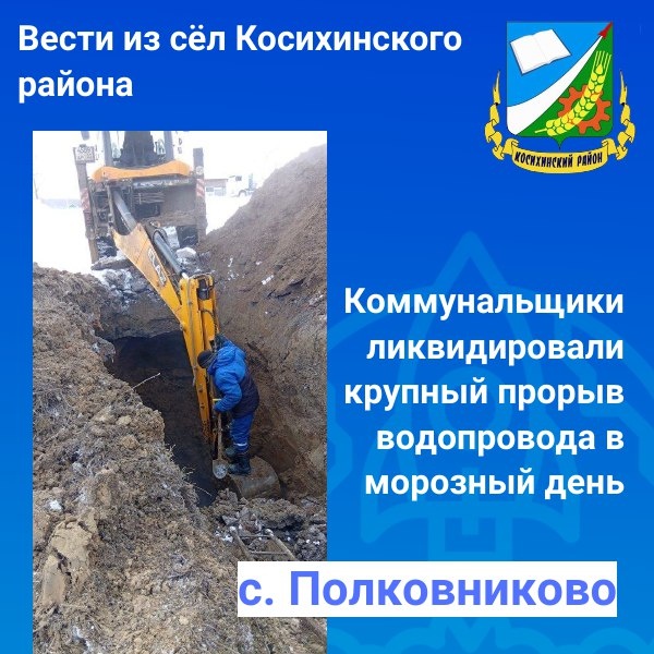 Специалисты МУП «Коммунальщик» устраняют аварию на водопроводе в сложных погодных условиях. Несмотря на сильный мороз, работники «Коммунальщика» оперативно приступили к ремонту серьезного повреждения трубопровода на улице Трактовая в с. Полковниково. Из-за аварии было временно приостановлено централизованное водоснабжение. Холодная погода значительно усложняет ремонтные работы, однако коммунальная служба мобилизовала все силы, чтобы восстановить подачу воды как можно скорее.... Ссылка на публикацию #Косихинскийрайон