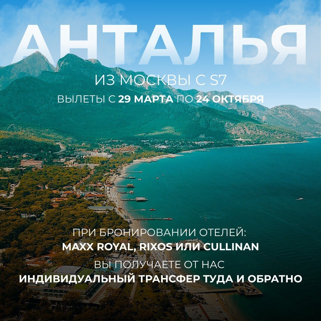 🔥 👍🙂👍👍 Анталья из Москвы с S7 При бронировании отелей: Maxx Royal · Rixos · Cullinan 🎁 В подарок получаете Индивидуальный трансфер ✈️ Вылеты с 29 марта по 24 октября ⏲️ Комфортное и удобное время вылета: S7 3745 08:45–13:55 S7 3746 14:55–19:30 Подборка туров на июнь 2026 на 2, 2+1, 2+2 смотрите в подборке ⬇️⬇️⬇️⬇️⬇️ 🛍🛍🛍🛍 https://qui-quo.ru/AI67-GW99 Для расчета на ваши даты, состав и количество ночей - обращайтесь