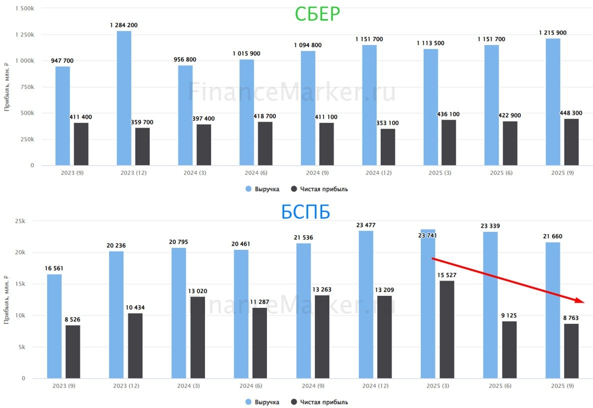 Сбер и БСПБ отчитались по РСБУ за 11 месяцев. Год подходит к концу и уже можно начинать подводить итоги. Они получились очень разные. Сбер За кого не стыдно в этот непростой год, так это Сбер! Банк отлично отчитался за ноябрь (и за октябрь тоже), избежав сезонного спада в прибыли. В отдельно взятом ноябре чистая прибыль выросла на 26,8% год к году! За 11 месяцев результат тоже достойный: +8,5% г/г. Ориентир по дивидендам: 37,8 рублей на акцию или 12,6% доходности. С учетом размеров зеленого банка, цифра более чем интересная. Есть ли подводные камни? 🧐 Если говорить про текущие цифры, то придраться можно к 2 вещам. Первое - операционные расходы, растущие на 14,8% г/г. Это все еще довольно много, но Сбер активно работает над их сокращением, особенно в непрофильных направлениях. Второе - снижение чистого комиссионного дохода на 2,7% г/г. Но это все детали, для Сбера (как прокси на экономику) гораздо важнее качество заемщиков в целом, которое в негативном сценарии может вылиться в рост ре