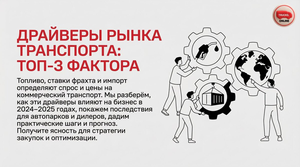 Владельцы автопарков и дилеры коммерческого транспорта часто ловят себя на мысли: почему цены на грузовики скачут, а спрос то растёт, то падает? Мы в TRUCKS.ONLINE видим это каждый день — рынок грузовиков и спецтехники в России сейчас сильно зависит от внешних сил. Драйверы рынка транспорта: топ-3 фактора — это топливо, ставки фрахта и импорт. Если их игнорировать, можно потерять маржу или упустить выгодные сделки. В этом разборе мы разберём, что происходит, почему и что делать, чтобы бизнес не стоял на месте.