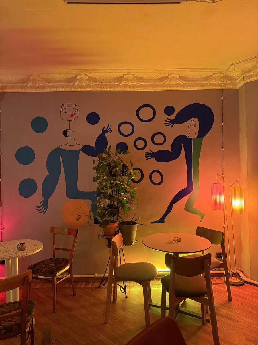 - Интерьер в стиле 80-х: плакаты, картины (особенно зашла «Мутный Пес»), вычурные детали, немного квартирник.