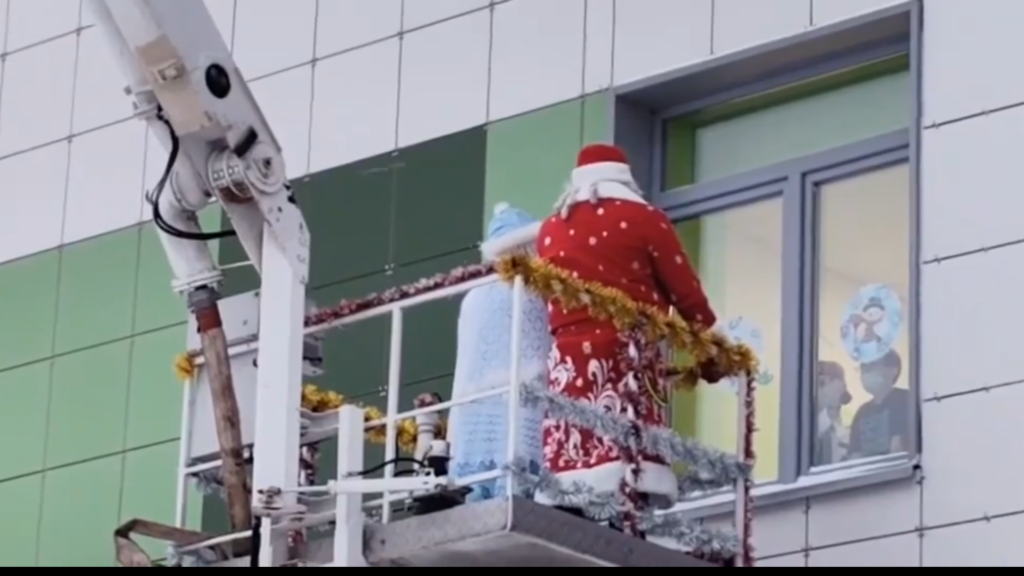 В Оренбурге Дед Мороз спустился на пожарном подъемнике к пациентам больницы