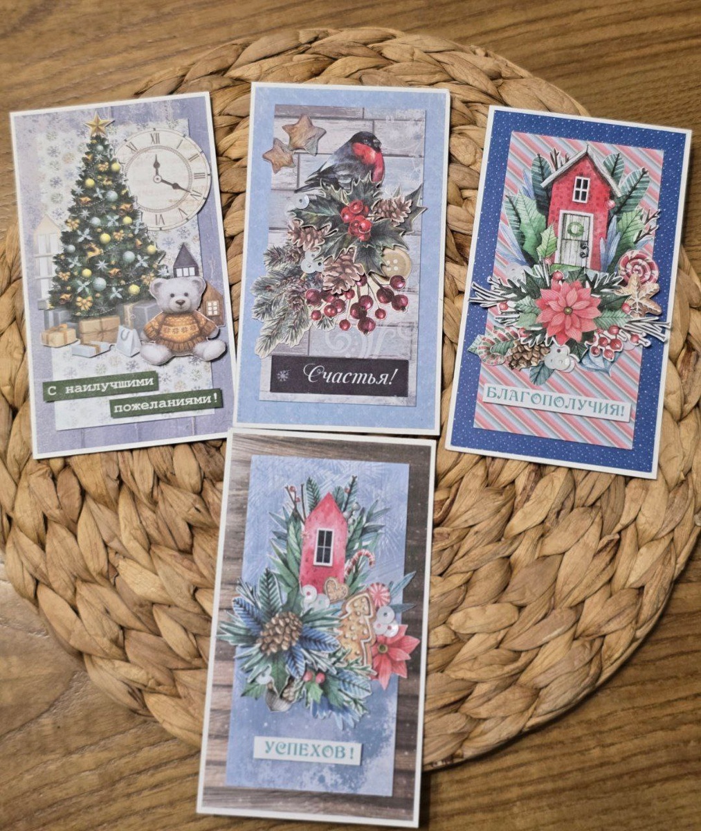 Вот такие праздничные открытки с новогодними поздравлениями делает моя мама! Вкладываю их к вашим игрушкам! Но так же можно заказать